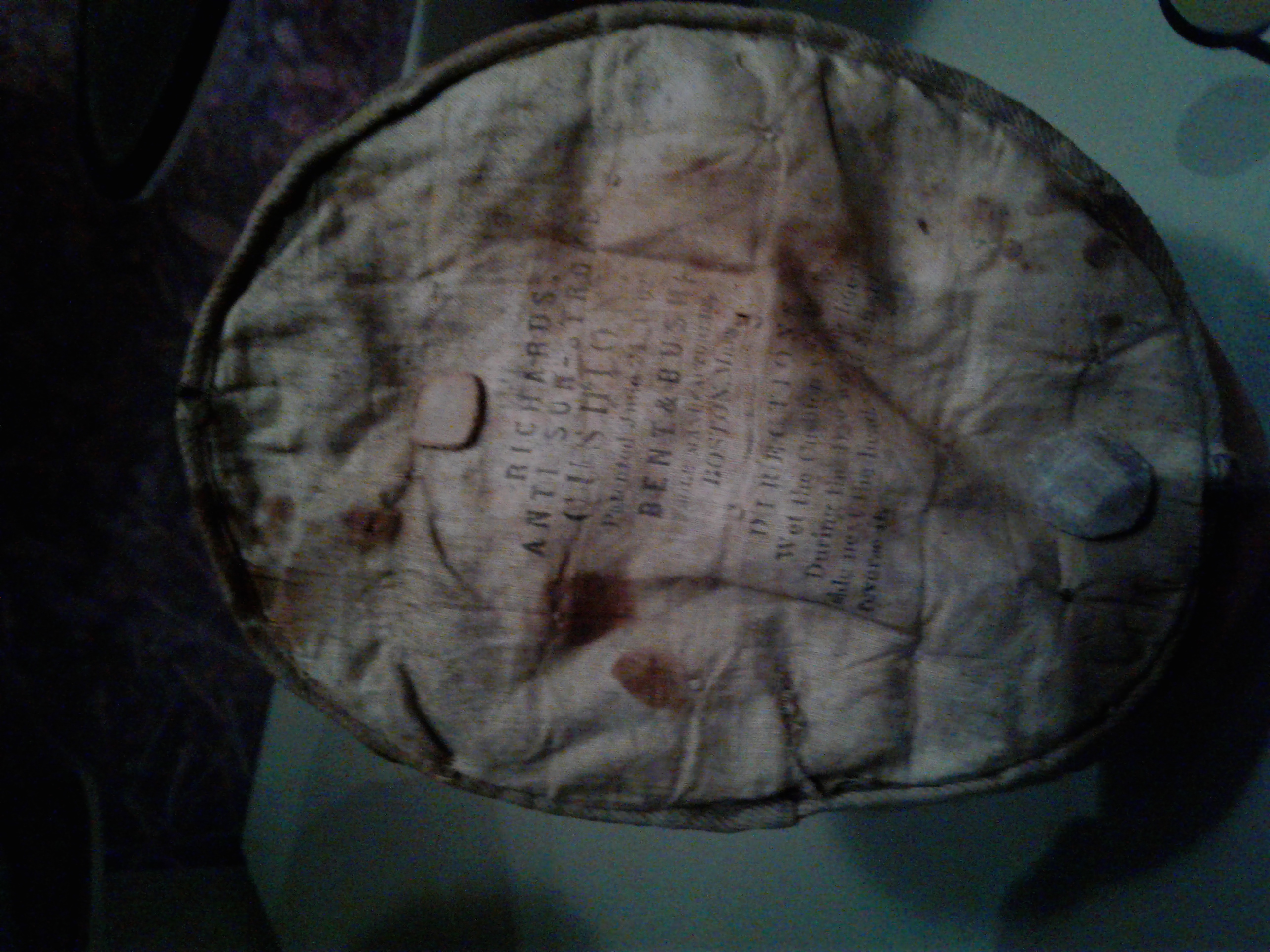 Richard’s anti sun stroke cushion, patented June 24, 1862, was made of cork, sea sponge. Wet with water, wear linen side next to head during the day, reverse at sunset.