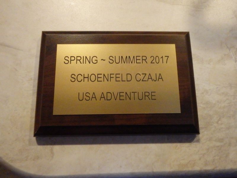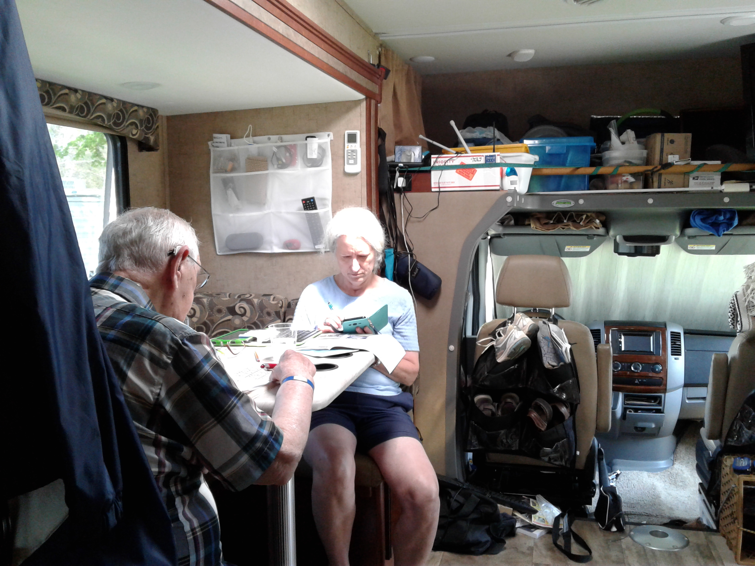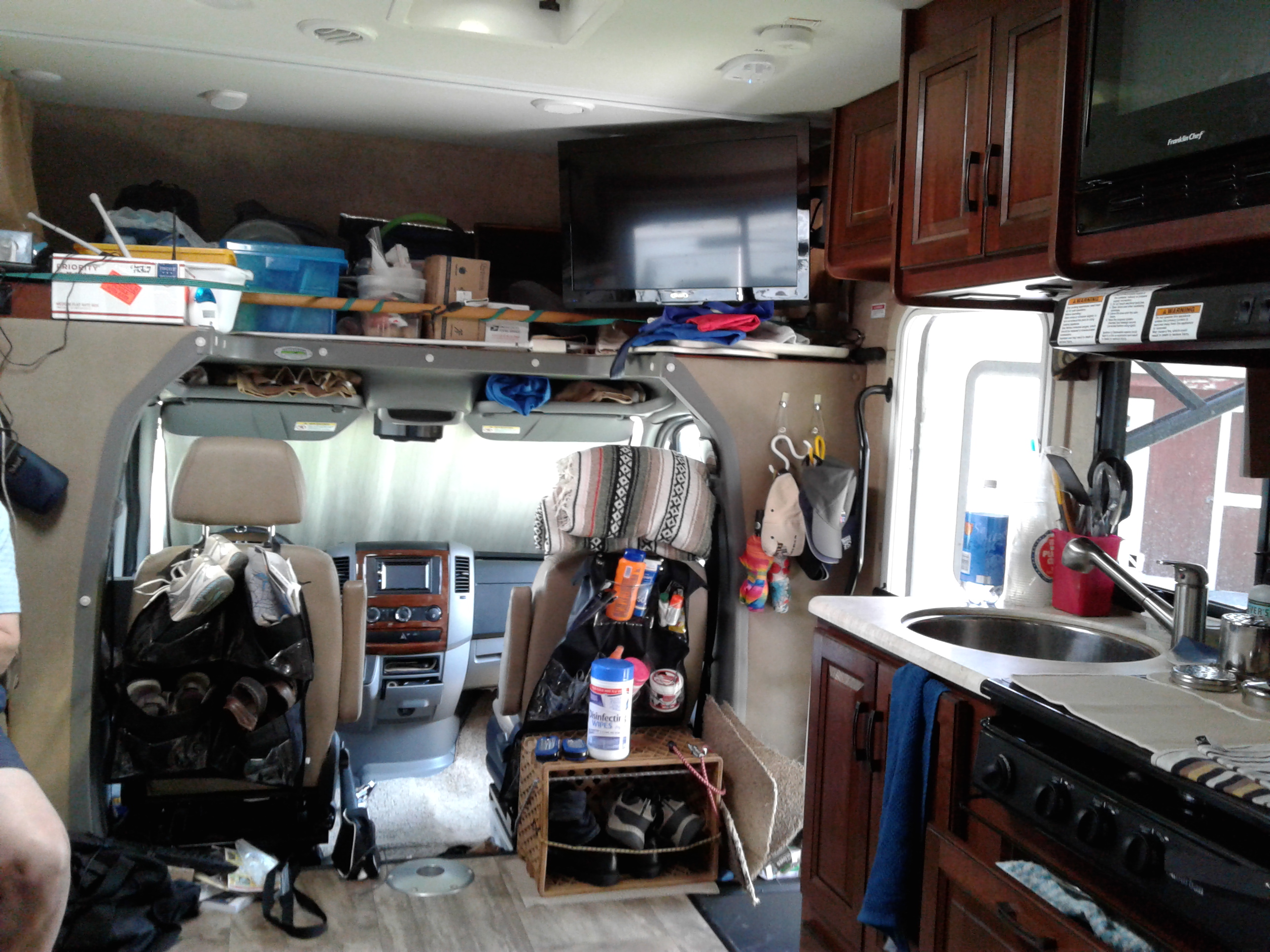 We pulled off the winter cover, converted the 3rd bed (over the cab) into an attic (storage space), replaced the heavy glass shower door with a shower curtain (RVs have a weight limit and 3 adults use up most of it!), moved all our stuff in, and set off. Inside (see pictures below), facing the front, on the left is the dining room/living room/John’s bed. Over the driver’s and passenger’s seats is the attic/3rd bed. TV#1, back door, and kitchen are on the right. The bathroom and master bedroom (with TV#2) are in the back. Kitchen has 3-burner stove top, micro/convection oven big enough for an 8″ pan, full-size fridge/freezer.