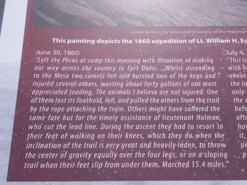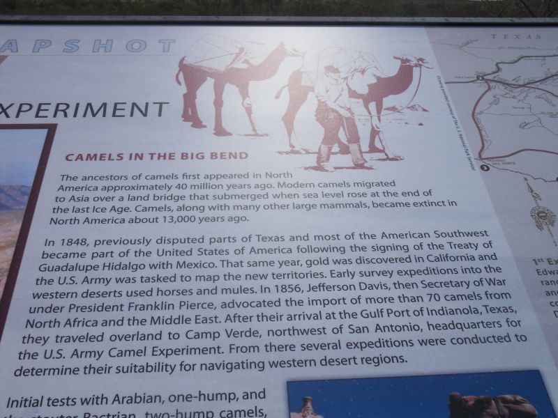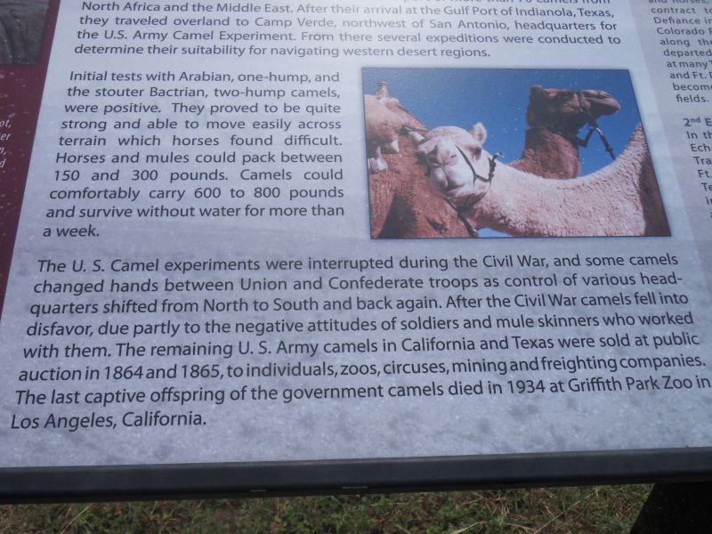 Learned about the mid-19th century U.S. Army Camel Experiments and camels’ superiority as pack animals in western desert areas. And even out here there were natural water holes, used since ancient times and more recently by ranchers, cowboys, and border patrol.