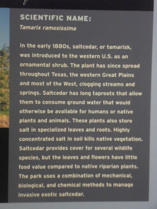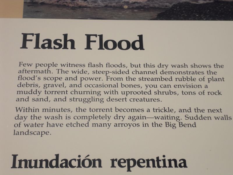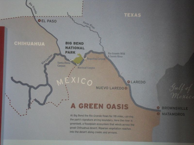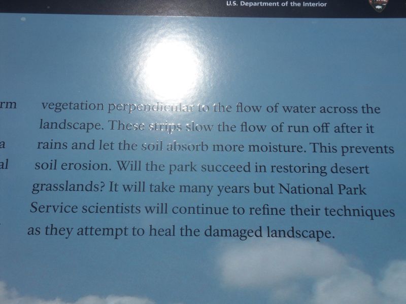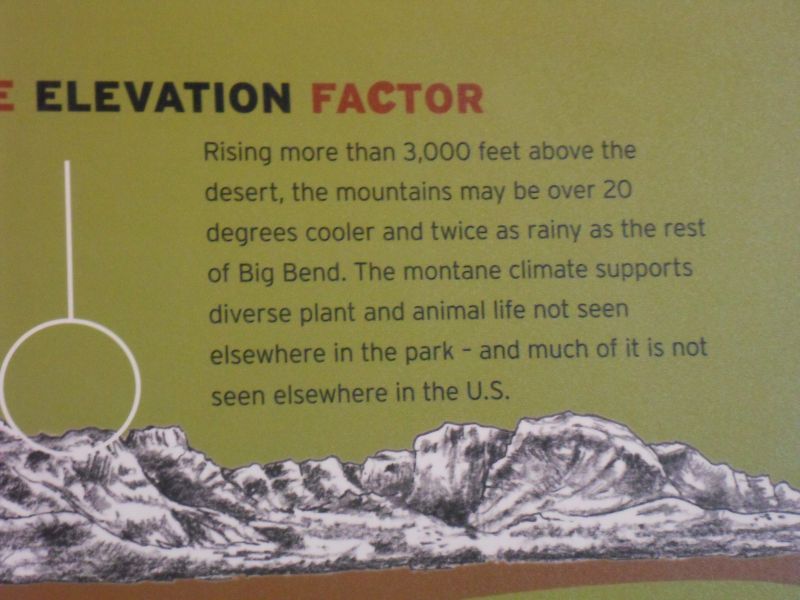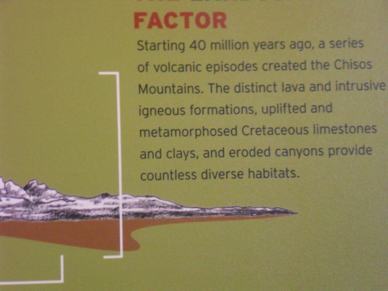 For eco-buffs: The park has a wide range of habitats. from 1,800 feet at its lowest point–the Rio Grande River–to 2,387 feet at its highest point–Emory Peak in the Los Chisos Mtns. Learned about efforts to restore viable rangeland destroyed by overgrazing, field crop production and modifications to natural drainage.