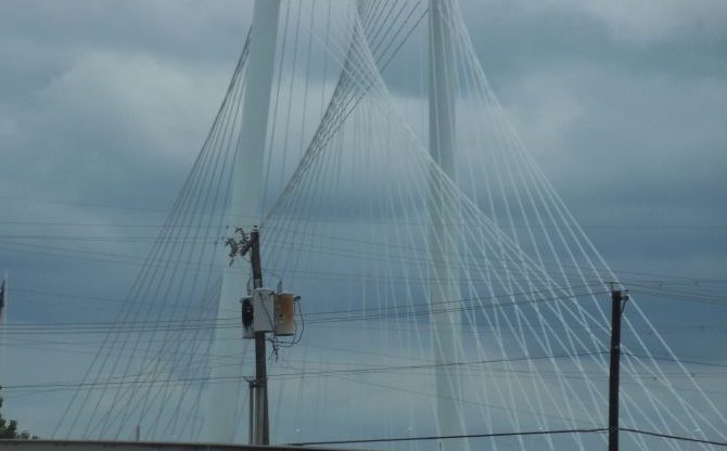 Driving to San Antonio. Still crazy hot here–107 degrees today. And crazy highway interchanges–pretty with 4-5 layers of overpasses soaring everywhere, but tricky to navigate. Stopped at the locally famous Little Czech Bakery; accident in parking lot, no injuries, car is a little banged up.