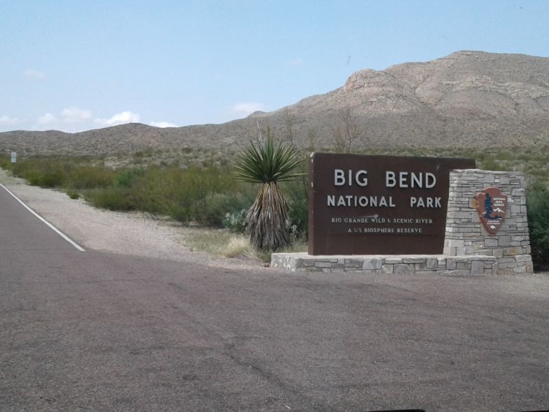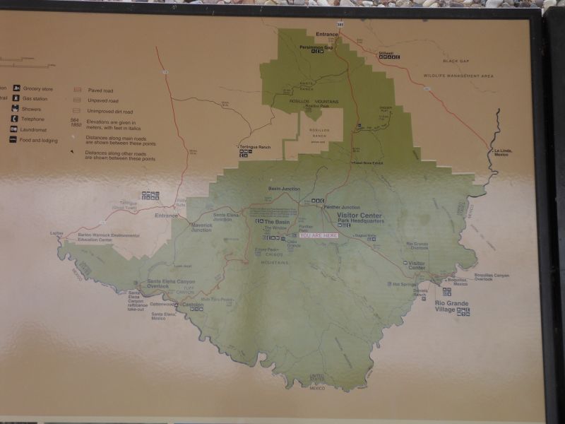 Drive another 54 miles west to Marathon, 42 miles south to park entrance / Persimmon Visitor Center (VC closed in summer), 49 miles to the Boquillas Canyon and Rio Grande overlooks (VC closed in summer), back 23 miles to Panther Junction, west 26 miles to Maverick Junction (VC and gas station were open here) and north out of park 58 miles to Alpine TX (such a nice name for town here in the desert). Total 252 miles. Sally was careful to plan for NOT getting stuck in the park overnight.